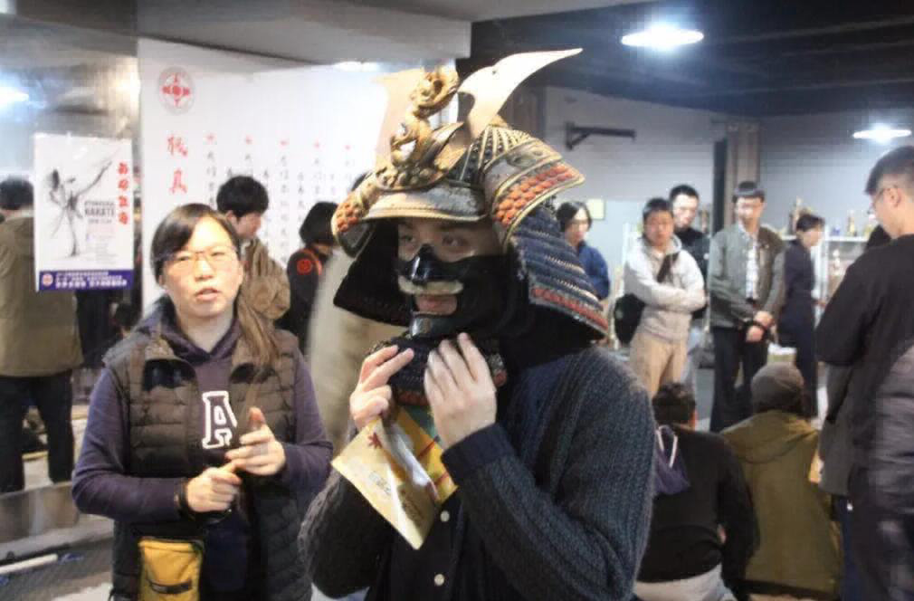 本次的古董甲胄依然由心武馆馆主 allen 提供,此套铠甲为萨摩藩传下,详细不明。像爱好者介绍了甲胄的各个部位的名称与作用,以及穿着次序后,向参会人员提供试穿体验。